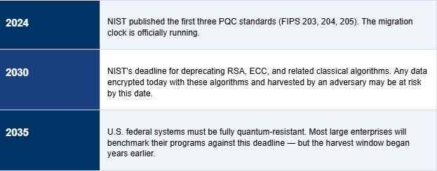 The uncomfortable reality: most enterprises will not complete application-level PQC migration before 2030 at the earliest. NIST's own deadline for U.S. federal systems is 2035. The harvest is happening now. The gap between today and PQC readiness is measured in years. That gap is your attack surface.